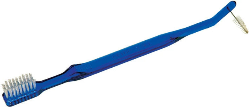 This double-ended Ortho Brush combines two brushes in one at half the cost! One brush end features a V-trim head, and the other has an interproximal brush for cleaning under wires and around appliances.